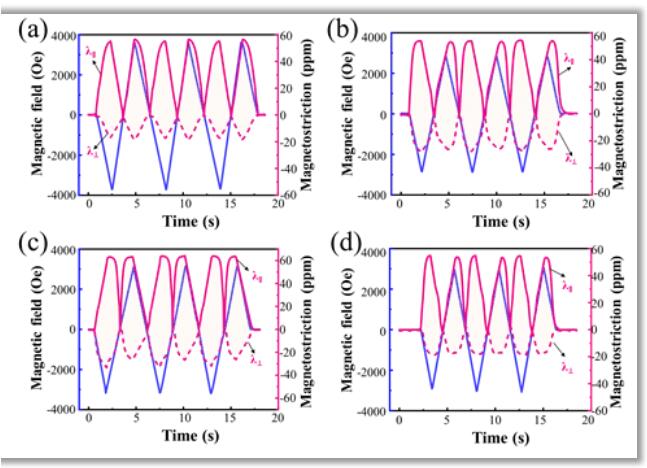 图5 (a)LPBFed、(b)MFA1300、(c)MFA2600和(d)MFA3900合金在交变磁场中的动态磁致伸缩响应。
