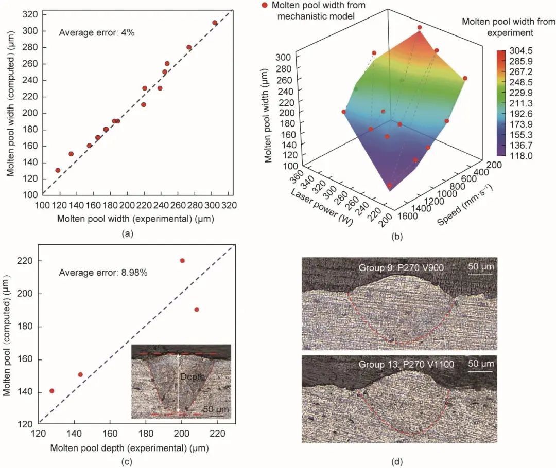 △机理模型的验证结果。(a)采用不同工艺参数得到的实验与机理模型熔池宽度对比;(b)不同工艺参数下的熔池宽度(彩图基于16组实验研究案例,红色数据点为机理模型得到的熔池宽度);(c)实验与机理模型所得熔池深度对比;(d)L-PBF打印AA2024样品的横截面。