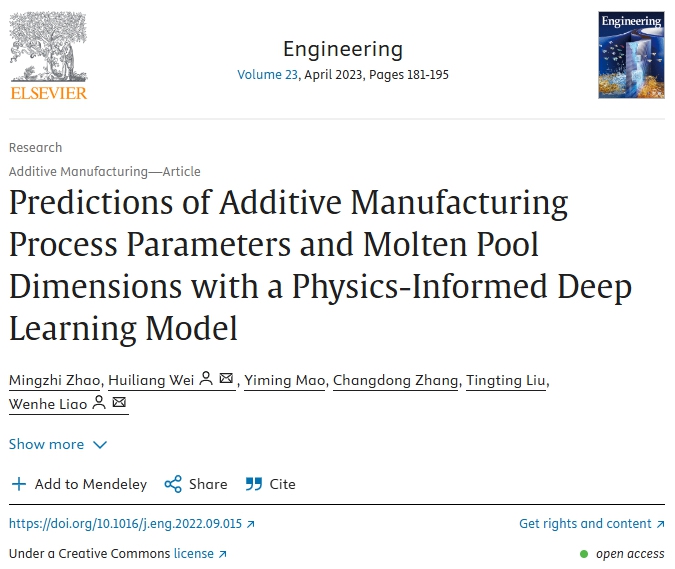 引用信息:Mingzhi Zhao, Huiliang Wei, Yiming Mao, Changdong Zhang, Tingting Liu, Wenhe Liao. Predictions of Additive Manufacturing Process Parameters and Molten Pool Dimensions with a Physics-Informed Deep Learning Model [J]. Engineering, 2023, 23(4): 181-195.