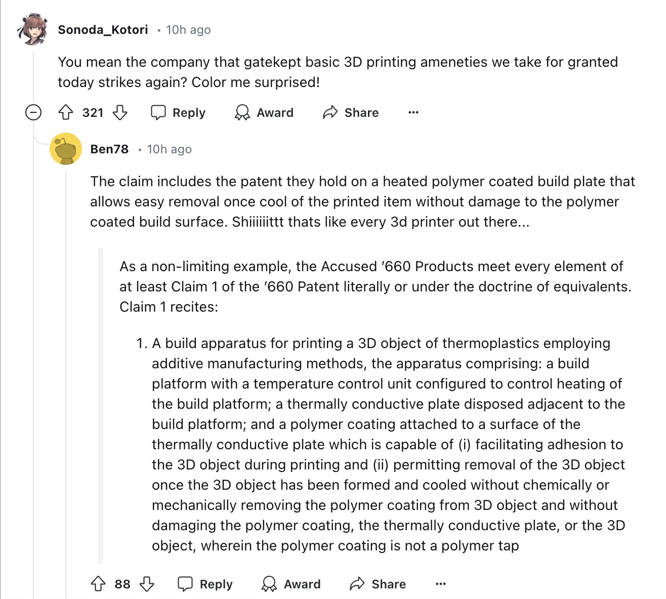南极熊注意到,国外一些网友对这一专利诉讼表示了强烈的关注和担忧。例如,有网友Ben78指出,构建平台配有温度控制单元,能够调节加热温度。导热板放置在构建平台附近,并涂有聚合物涂层,这层涂层能帮助打印物体在打印过程中牢固粘附。物体冷却后,可以轻松取下,而不会损坏涂层、导热板或打印物体。这些专利技术可能普遍存在于几乎所有3D打印机中,因此其影响可能非常广泛。