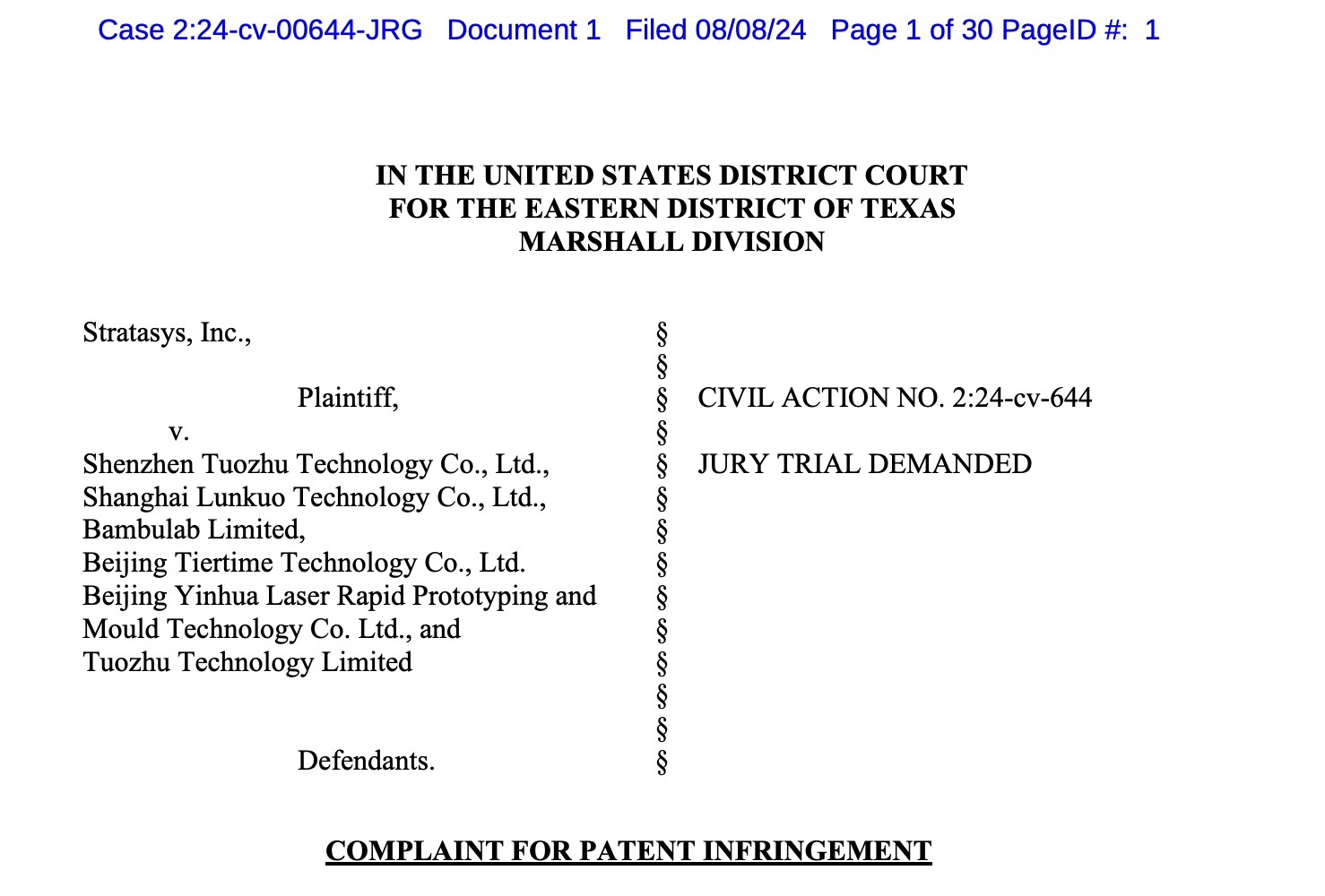 2024年8月10日,全球3D打印大厂Stratasys宣布已在美国东区地方法院对6家中国3D打印公司提起专利侵权诉讼。被告包括: