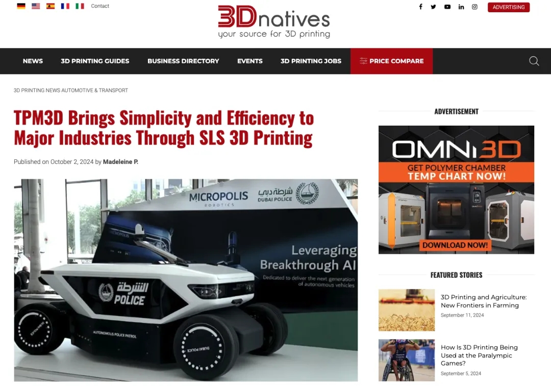2024年10月2日,国外3D打印(增材制造)领域知名媒体平台 3Dnative 发布了一篇关于盈普三维的专题报道。这篇报道深入剖析了盈普三维在3D打印技术领域的创新与发展,展现了产品应用以及在多个行业领域的成功案例。以下全文为中文版本。