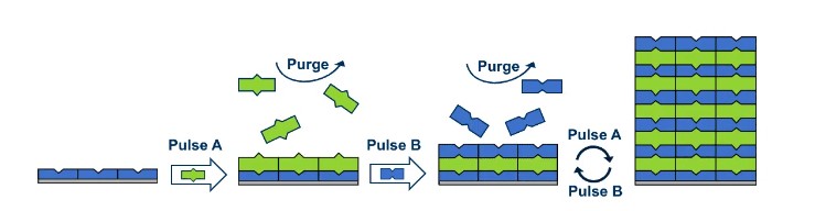 △ALD 工艺图:前驱体引起的化学反应会留下一层单原子厚的涂层,重复此过程几乎可以在任何表面上构建多层