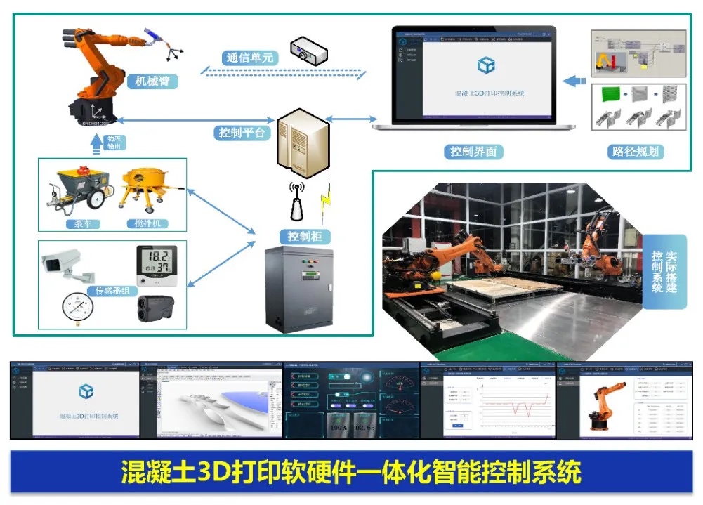 控制系统具体包括系统设置、运动控制、工艺流程控制、工况监测、数据监测与采集五大功能,实现了混凝土3D打印全工艺过程的安全监控、实时反馈、数据采集、打印数据的批量采集、分析,达到3D打印核心技术工厂化多设备系统精准协同。