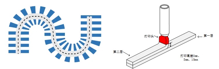 △平面路径拟合技术(左) 矩形挤出端打印示意(右)