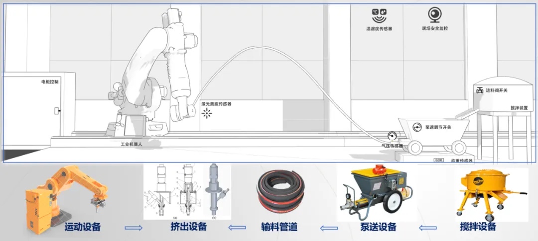 全工艺流程3D打印控制系统,基于现场总线架构设计,融合机器人运动控制、传感、现代通信、工业以太网等前沿技术,智能集成所有相关软、硬件,包括混凝土拌合系统、材料泵送系统、工业机器人软硬件系统、3D打印工具端系统,实现了一套系统全流程全设备的控制、监测、预警,解决了材料、环境、设备、参数实时协同及工况监测、人机交互、安全防护等关键技术问题。