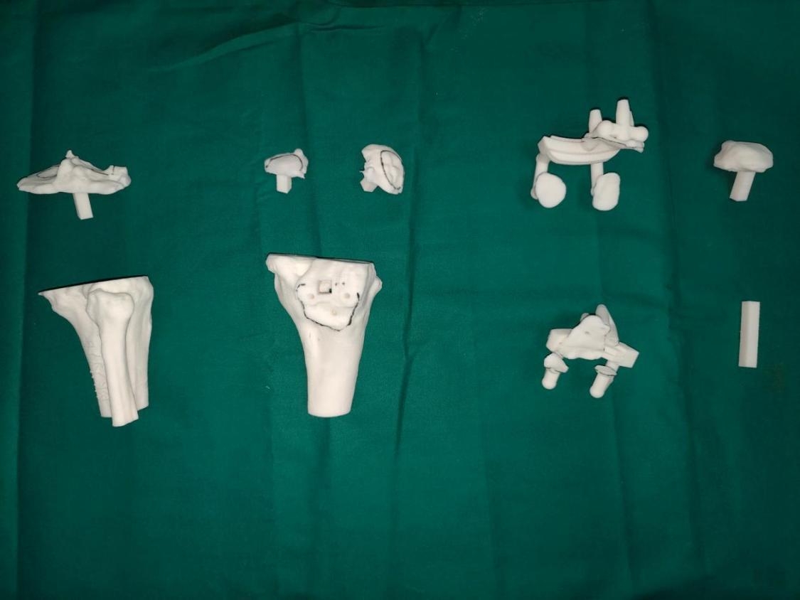 考虑患者膝关节外畸形程度较为严重,为了获得更精确截骨、减少膝关节力线偏移、缩短手术时间,汪龙提出,可通过计算机三维可视化重建骨骼模型,AI人工智能骨块分割、骨块空间位置校准等智能操作,模拟匹配全膝关节置换术中截骨操作,3D打印个性化膝关节截骨模板,术中应用可达到股骨远端、胫骨近端的高精度截骨,良好地完成TKA术中伸直间隙的操作,同时减少膝关节力线偏移,进而缩短手术时间。