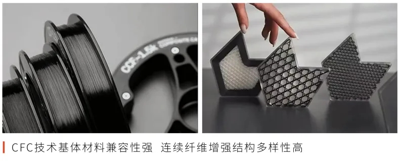 碳纤维及其复合材料被认为是新质生产力的典型代表,是未来产业及战略新兴产业。连续碳纤维3D打印技术将增材制造与复合材料加工工艺有机结合,既突破了传统复材形状结构单一且难加工的限制,又解决了非金属3D打印强度低的问题。在航空航天,汽车,低空经济,机器人,机械制造等领域有着广泛应用。
