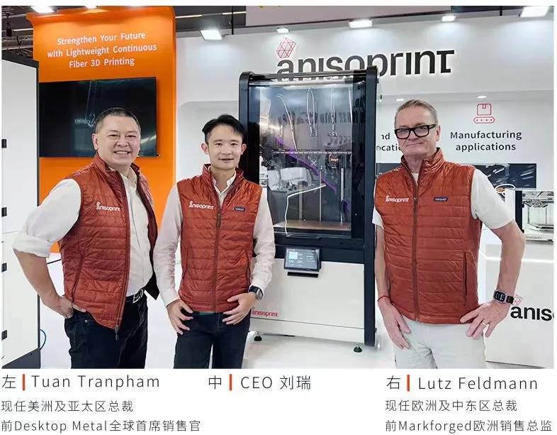 阿奈索秉持着人才国际化,市场全球化的发展战略,致力于打造连续纤维3D打印全球第一品牌。成立一年内,公司分别任命前Desktop Metal公司全球首席销售官Tuan Tranpham为美洲及亚太区总裁,任命前Markforged公司欧洲销售总监Lutz Feldmann为欧洲及中东区总裁。在CEO刘瑞的邀请下,3D打印行业巨头公司前高管们的纷纷加入,说明了国际市场对阿奈索产品实力及品牌的高度认可。