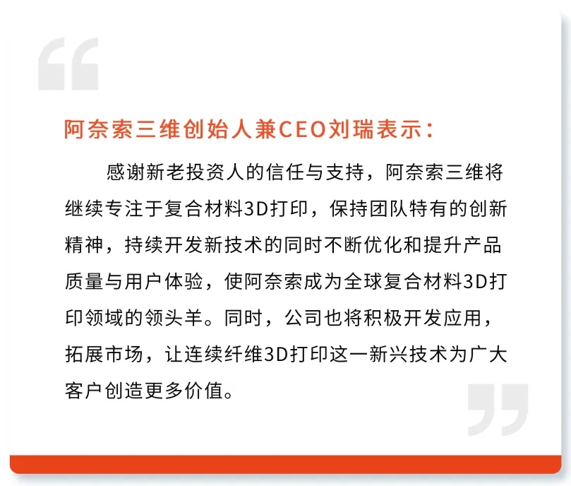 2024年12月23日,阿奈索三维宣布成功完成近亿元人民币A轮融资。公司专注于高科技复合材料连续纤维3D打印,成立伊始便获得顶级风险资本的支持,本轮融资由广发信德领投,国鼎资本,合世家资本跟投,阿奈索赢得了产业资本、头部风险投资机构、私募股权投资等各类投资人的支持与认可。这笔资金将用于加速推动产品研发、产能扩建以及全球业务布局。