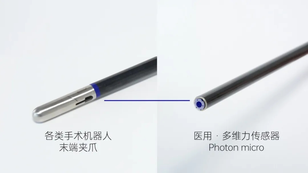 在与民生相关息息相关的医疗领域,手术机器人同样也是具身智能的重要载体,也是下一代医疗器械的发展方向。针对手术机器人领域的末端力觉反馈难题,2024年华力创科学发布了针对腹腔镜手术器械末端夹爪的微型医用多维力传感器Photon micro,成功在手术器械末端极端空间结构中集成了高精度六维力传感器,利用金属3D打印的技术优势,解决了阻碍六维力传感器在医械领域应用的生物相容性问题,结构微小且异形问题,更得益于“光学多维力传感”无惧温漂,不惧消杀的技术特点,打破了国际最先进的第5代达芬奇手术机器人的力反馈技术壁垒。