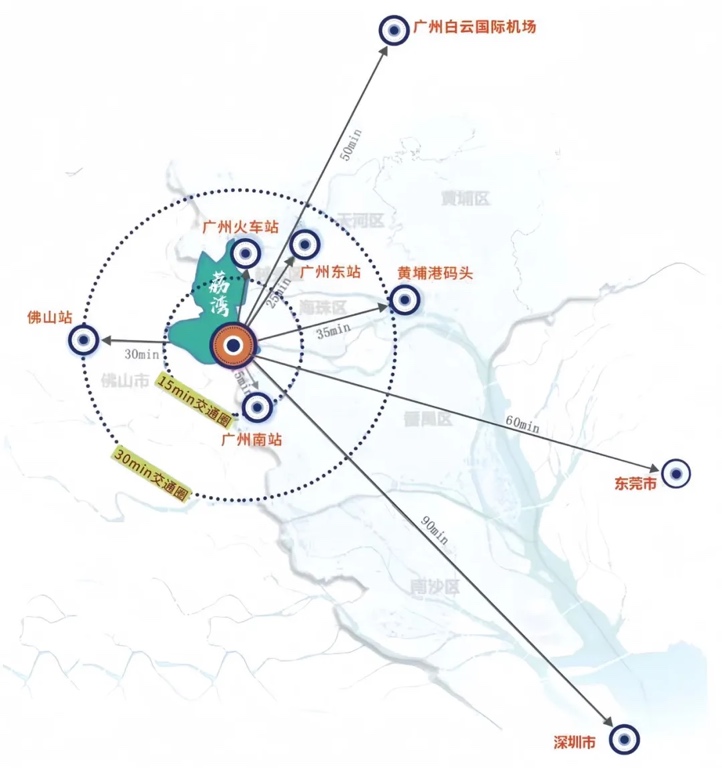 位于荔湾区东沙街道,毗邻海珠、番禺与佛山市南海区,区位优势明显,是广州市"西联"和“南拓”战略的重要枢纽,距离地铁10号线广钢新城站约277米(预计2025年开通)。