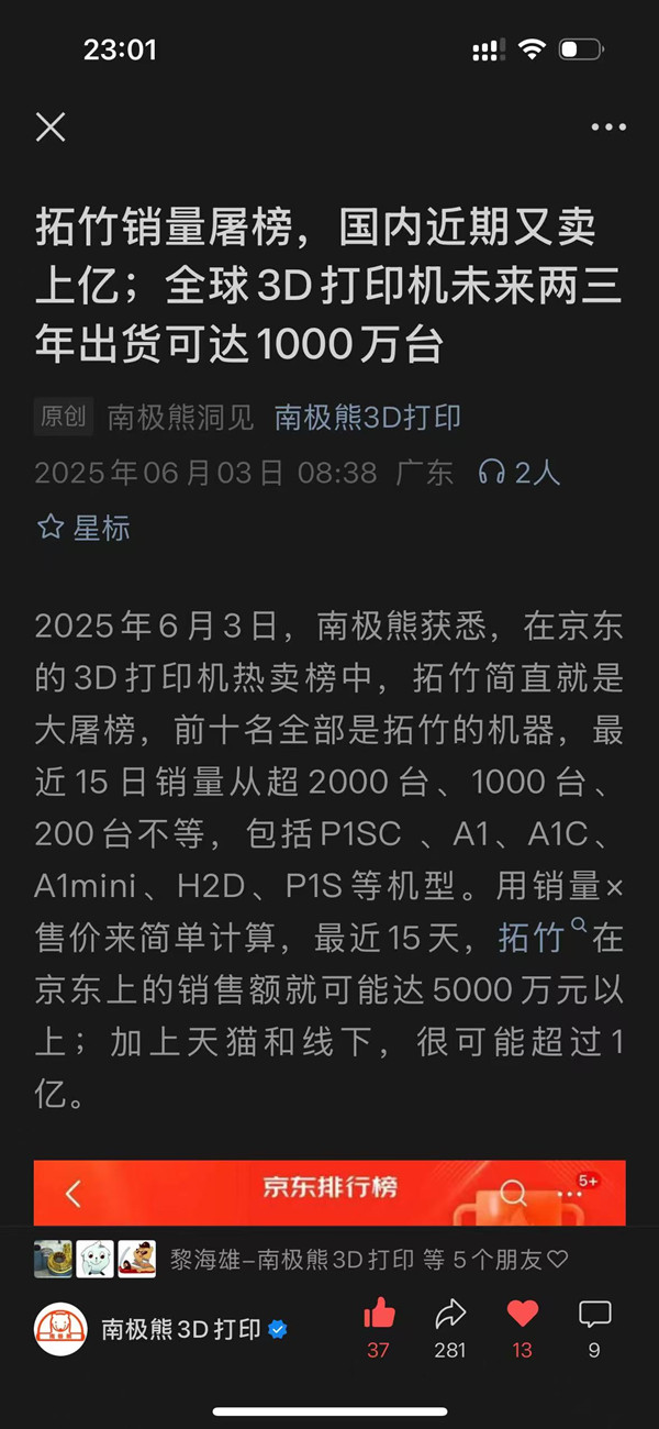 脑洞:消费级3D打印龙头拓竹如果今天A股上市,市值可能破1000亿