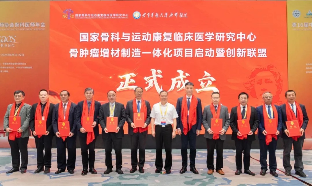 2025年7月3日,国家骨科与运动康复临床医学研究中心(以下简称“国家临床中心”)骨肿瘤增材制造技术创新联盟在CAOS年会正式成立!首任理事长由空军军医大学唐都医院骨科郭征教授担任。“骨肿瘤增材制造一体化项目同期正式启动。联盟旨在通过医工企协同、产学研医一体化创新发展,推动增材制造技术在骨肿瘤领域有效应用,提高我国骨肿瘤外科治疗水平。