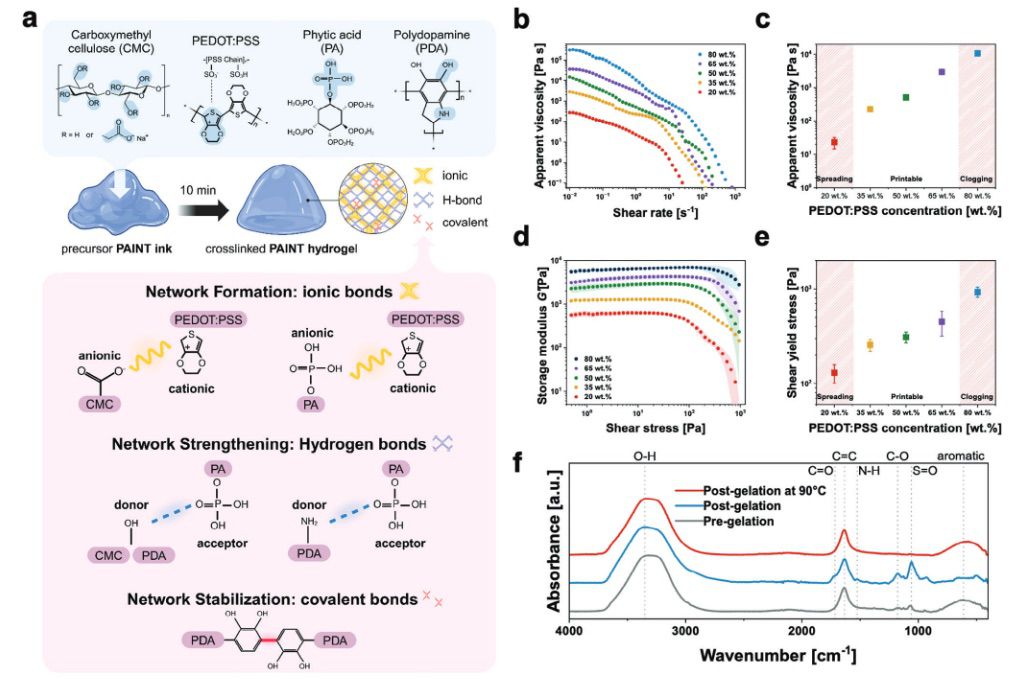 CMC中的羧甲基基团可提供离子键和氢键,PDA中的氧化邻苯二酚基团可提供邻醌的部分共价键和氢键,带正电荷的PEDOT:PSS骨架与PA中的带负电荷的磷酸基团可产生离子相互作用,磷酸基团与CMC和PDA中的供体羟基键合产生交联。高浓度的PEDOT:PSS聚合物链密度增强了分子间的相互作用并促进了链的缠结,限制了所有聚合物链的流动性,导致表观粘度、存储模量G'和剪切屈服强度呈上升趋势。