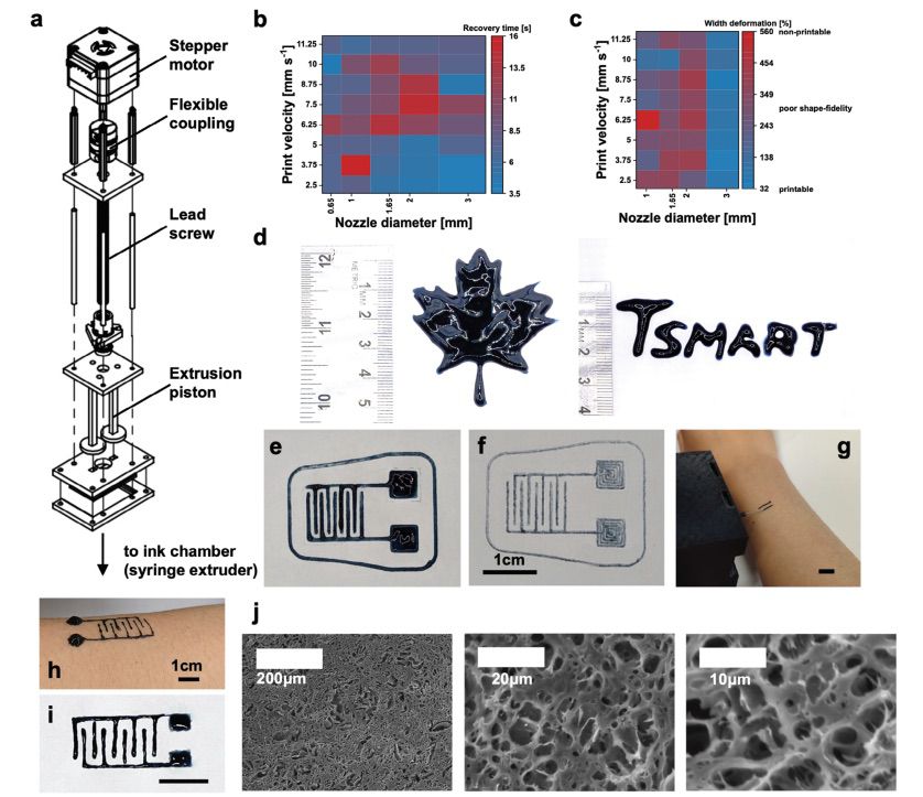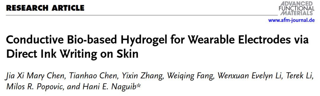 有鉴于此,多伦多大学Hani E. Naguib等人利用生物基聚合物之间的物理交联机制开发一种可导电的自粘附水凝胶直接在皮肤上打印可穿戴电极。由于在皮肤上的原位凝胶化转变,降低了接触阻抗,展示了其在个性化、效率和舒适度方面改善未来医疗保健应用的潜力。