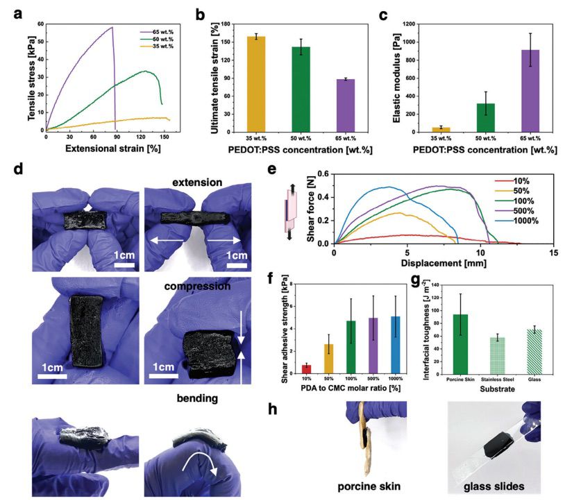 PEDOT:PSS与CMC-PEDOT溶液的比例分别为35、50和65wt%。交联后,所有三种浓度的印刷水凝胶都能承受适度的拉伸和压缩应变,在PAINT水凝胶在88-159%的伸展应变范围内失效之前,能与人体皮肤因自然组织拉伸而产生的25%表面应变相匹配。浓度增加近一倍会导致极限拉伸应变降低50%,但弹性模量和韧性却增加10倍。含量为65 wt% 的水凝胶在交联后表现出最佳的机械强度和结构完整性,同时还能与人体的弯曲和移动表面保持保形接触。增加PDA浓度可提高粘合强度,达到PDA负荷阈值后,剪切粘合强度会趋于稳定。PAINT水凝胶具有自粘性和类似皮肤的柔韧性,能够在整个运动过程中与非平面表面保持保形界面。
