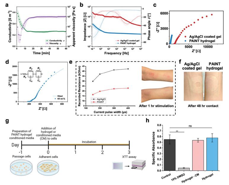 在凝胶化过程中,PEDOT:PSS或PDA可能会发生进一步的相分离,从而影响导电网络的均匀性,这反映在电导率的高偏差上。与猪指关节生物系统接触时,PAINT水凝胶在很宽的频率范围内始终显示出比Ag/AgCl涂层凝胶电极更低的阻抗。与PAINT电极相比,Ag/AgCl涂层凝胶电极通过1小时1 mA电流幅值的刺激诱发了严重的皮肤刺激,这是因为PAINT电极在刺激器记录到的界面阻抗更高。PAINT水凝胶与L929培养3天后,表示细胞活力的比吸光度与使用普通细胞培养基的对照组相比无明显差异。水凝胶与细胞接触48小时后没有观察到对皮肤的刺激。