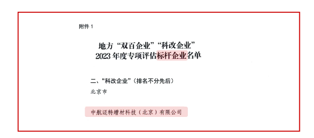 2024年7月10日,国务院国资委印发《关于印发地方“双百企业”“科改企业”2023年度专项评估结果的通知》,作为北京市市属国企京城机电旗下企业,中航迈特增材科技(北京)有限公司从此次纳入考核的302户“科改企业”中脱颖而出,获评最高级—“标杆”企业。
