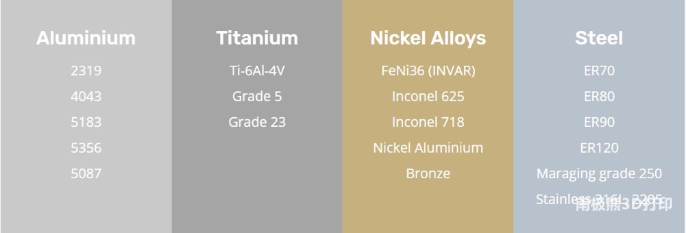 △Arcemy模块可以打印的材料,包括铝合金、钛合金、镍合金、不锈钢等