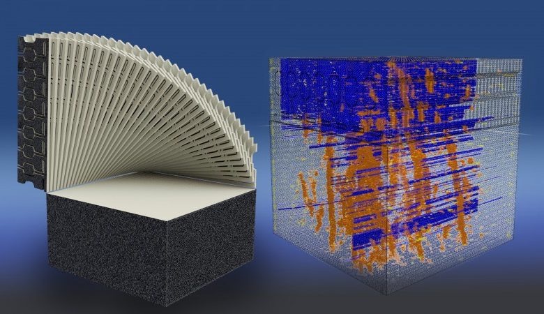△左侧的3D打印部件被切成小块,通过拉伸直至断裂来测试每个小块的抗拉强度。右侧的相同打印部件的数字副本已通过AI模型进行分析,以找出其结构中的异常