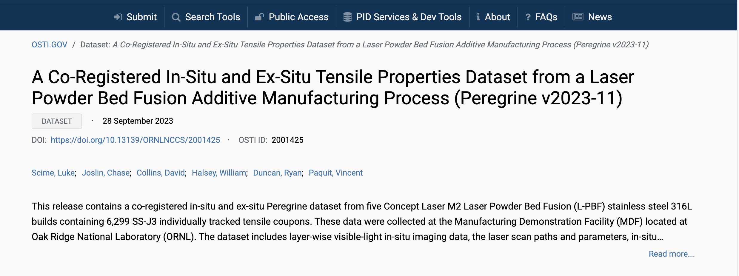 生成的数据集是能源部核能办公室资助的先进材料与制造技术计划的一部分。这些数据和其他智能制造方法正在被用于加速先进制造技术的开发、鉴定、示范和部署,以实现可靠且经济的核能解决方案。