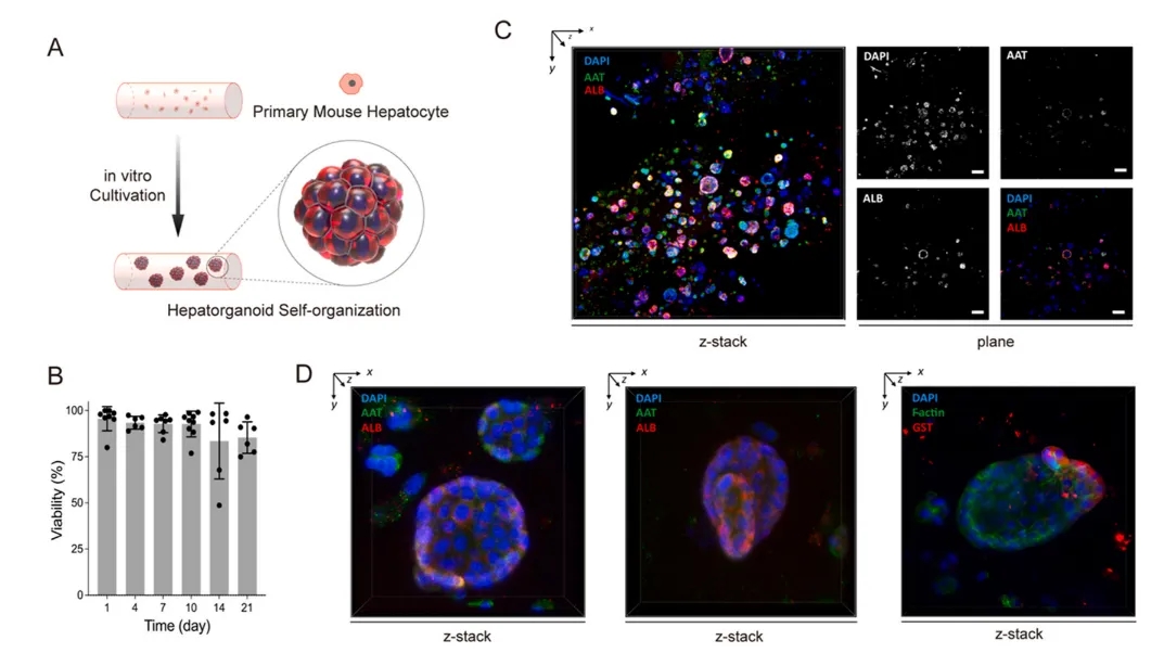 从小鼠中分离出主要肝细胞(PMHs),并采用特定的培养基诱导其形成肝细胞球体。同时培养了内皮细胞系C166,用于后续的血管结构打印。