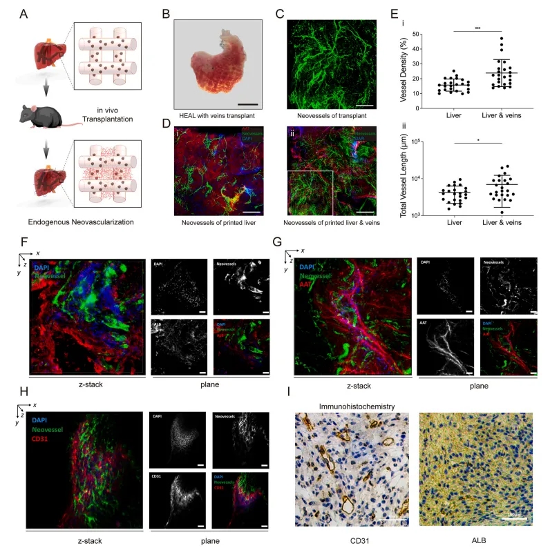 A. 新生血管的示意图展示了通过保留肝细胞球体装载层之间的空隙促进内源性新生血管。这种设计利用了打印结构中的空隙,为血管新生提供了空间,从而有助于血管从宿主组织向移植的肝脏组织生长。B. 移植后血管化的HEAL的明场图像展示了移植后14天的血管化HEAL的明场图像,显示了在打印格子结构的自由空间上的血管生成。图像显示了在HEAL结构中形成了丰富的血管网络,这表明移植的肝脏组织能够与宿主的血管系统相连,从而获得必要的营养和氧气。C. 通过尾部注射荧光地克司蓝,展示了功能性新血管。荧光图像清晰显示了新形成的血管网络,证明了这些血管是功能性的,能够运输血液和营养物质。D. AAT阳性移植部分的新血管荧光图像展示了在AAT(α1-抗胰蛋白酶)阳性移植部分上的新血管的荧光图像。AAT是一种肝脏特异性蛋白,其阳性区域表明这些新血管与肝脏组织相连,进一步证实了血管新生的成功。E. 血管密度和总血管长度的定量展示了有无静脉结构的HEAL的血管密度和总血管长度的定量结果。数据表明,包含静脉结构的HEAL在平均血管密度和总血管长度上均显著高于仅打印肝脏结构的HEAL,这表明静脉结构的引入显著促进了血管新生。F-G. 肝细胞和血管标记物的共聚焦图像显示了肝细胞和新血管的共存,表明这些新血管不仅形成了,而且与肝脏细胞紧密相连,这对于肝脏功能的维持至关重要。H. 血管标记物CD31的共聚焦图像展示了在血管标记物CD31阳性移植组分上的新血管的共聚焦图像。CD31是一种内皮细胞标记物,其阳性区域表明新血管的形成是由内皮细胞的增殖和迁移驱动的。I.通过CD31和ALB免疫组化染色,确认了移植后2周内HEAL中维持的肝脏功能和显著的新生血管。免疫组化染色结果进一步证实了HEAL在移植后不仅保持了肝脏功能,还成功促进了血管新生,这对于移植肝脏的长期存活和功能至关重要。