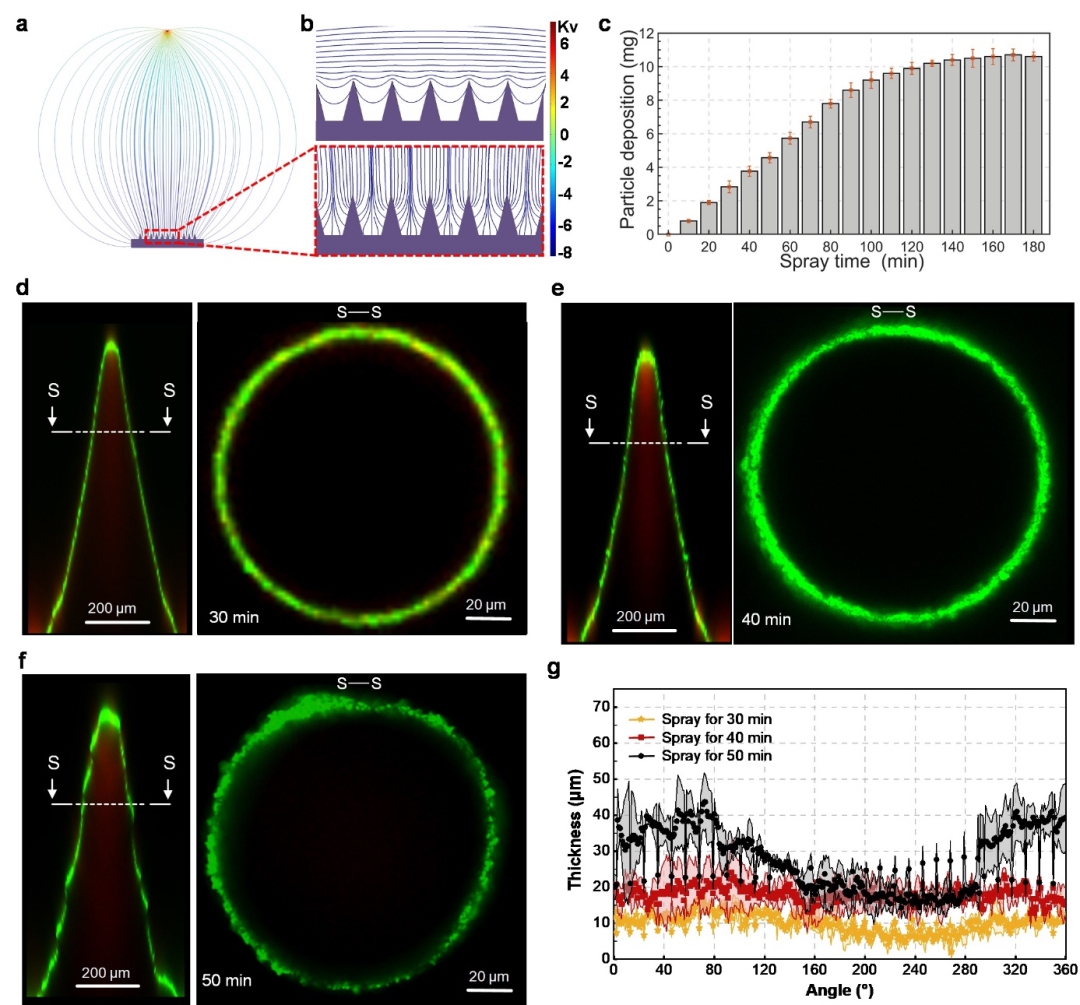微针尖端与电源附近的电位基本相同,这有助于微粒均匀雾化。粒子主要沉积在微针上,然而,随着粒子继续沉积,电场尖端效应减弱,使得粒子开始在-基底或贴片外部随机沉积。累积粒子重量与喷雾时间的比例关系仅在前80 min内成立。荧光图像显示,50 min时,粒子存在显著差异。同样,静电雾化微针粒子的层厚度波动明显高于30 min和40 min。这种波动可能是由过量沉积造成的,使得粒子与PVP内芯隔离,从而导致它们随机粘附(图2)。