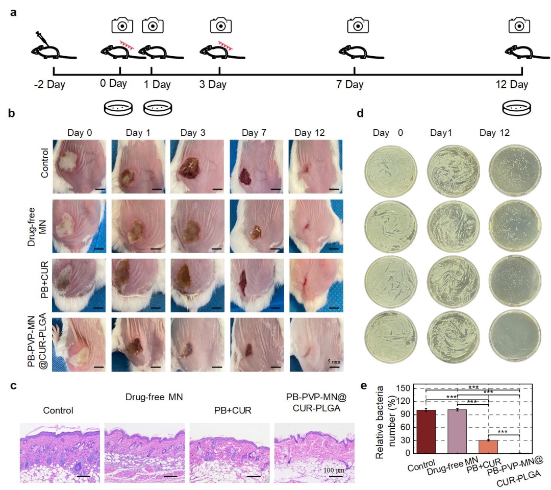 该团队评估了微针对金黄色葡萄球菌感染小鼠的体内抑制效果。PB-PVP-MN@CUR-PLGA组的损伤在治疗12天后完全愈合。相比之下,其他治疗组的损伤仍然存在。此外,临床分析表明,PB-PVP-MN@CUR-PLGA 组在治疗第12天时病变几乎愈合,皮肤的炎症细胞较少。相反,在其他治疗组中则观察到了严重的感染症状,如更多的炎症细胞和更厚的表皮。这证明了微针可以有效穿刺皮肤并直接向受感染小鼠的皮下组织输送药物,从而加快了愈合过程(图4)。