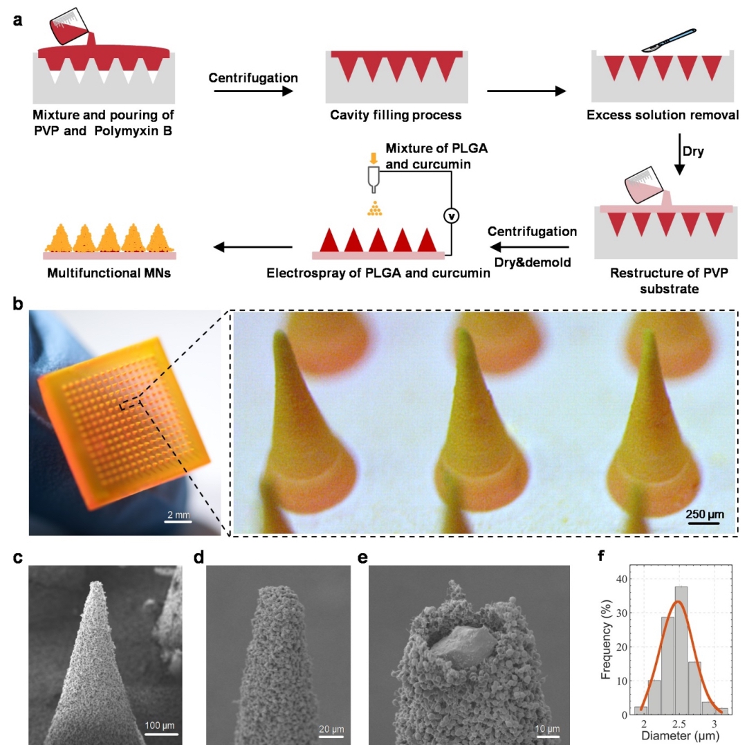 针对以上问题,中国科学技术大学精密机械与仪器系徐晓嵘教授、中国科学技术大学苏州高等研究院胡祥龙教授研究团队合作开发了一种能够同时装载PB和CUR的多功能微针。这些微针在高湿度环境中表现出色,通过装载CUR的药物层成功解决了药物输送的难题。实验证明,这种技术对细菌的影响显著,为未来的临床应用提供了广阔的前景。