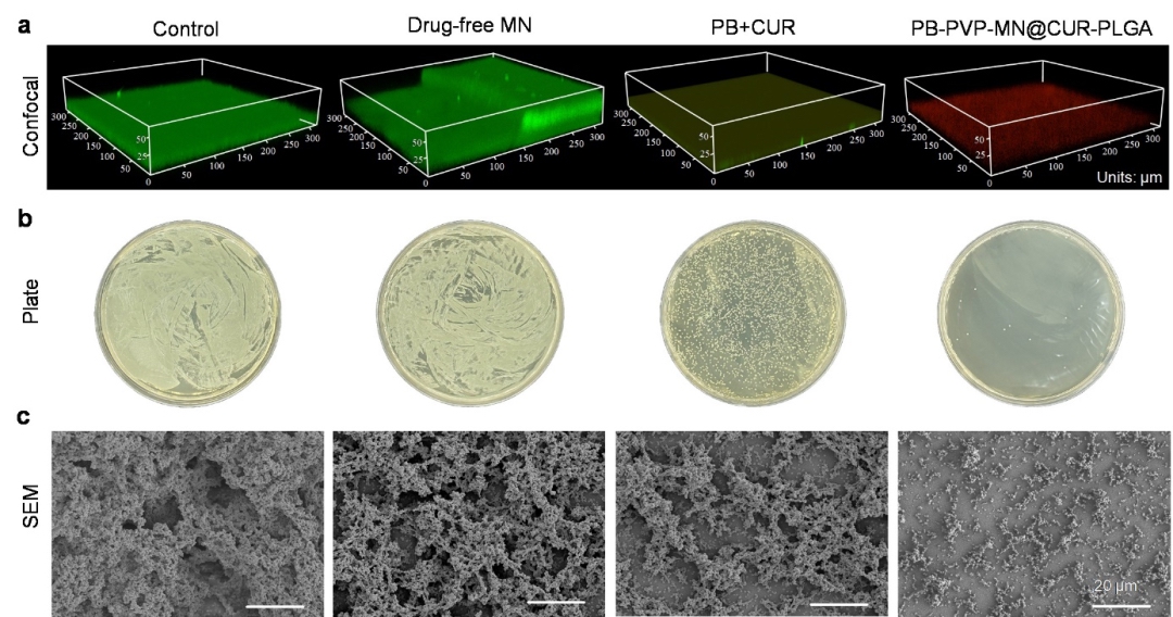 该团队将共负载PB和CUR的多功能微针(PB-PVP-MN@CUR-PLGA)朝下放置在生物膜覆盖的盖玻片上,无载药的微针也经历了相同程序。对照组和无药微针组样品中仍存在大量活性细菌。相比之下,PB-CUR和PB-PVP-MN@CUR-PLGA能有效减少生物膜厚度。PB-PVP-MN@CUR-PLGA组中细菌的灭活率接近99%。这表明通过物理破坏生物膜可以提高药物输送效率,对于杀灭深层细菌至关重要(图3)。