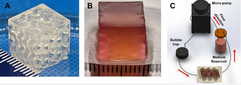 △ A)生物打印的血管化结构,具有由互连通道组成的陀螺体设计 B)生物打印的人肝组织结构 C)含有组织结构的流通室连接到灌注系统