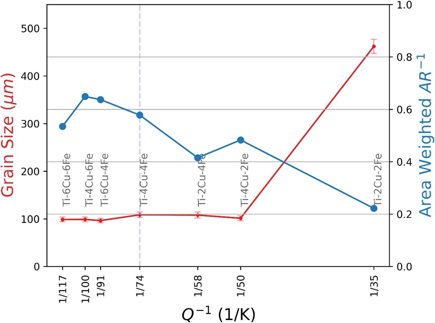 图 10.晶粒尺寸和面积加权长宽比倒数与 Q 值倒数的关系。Q