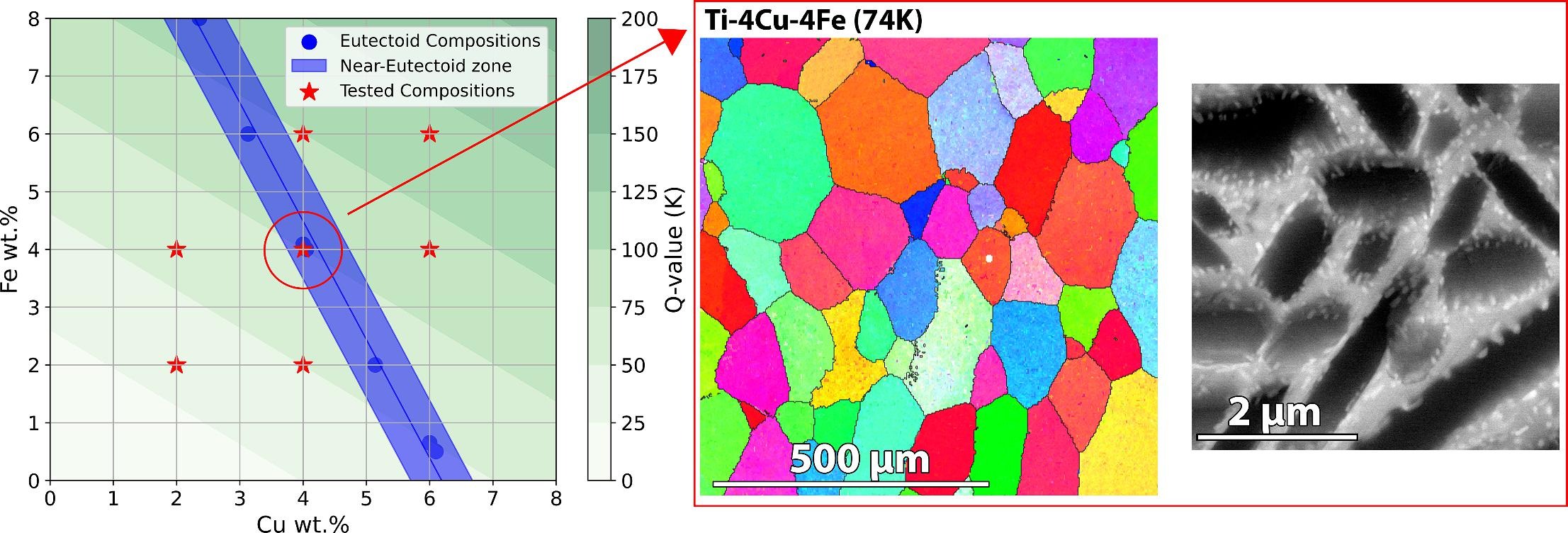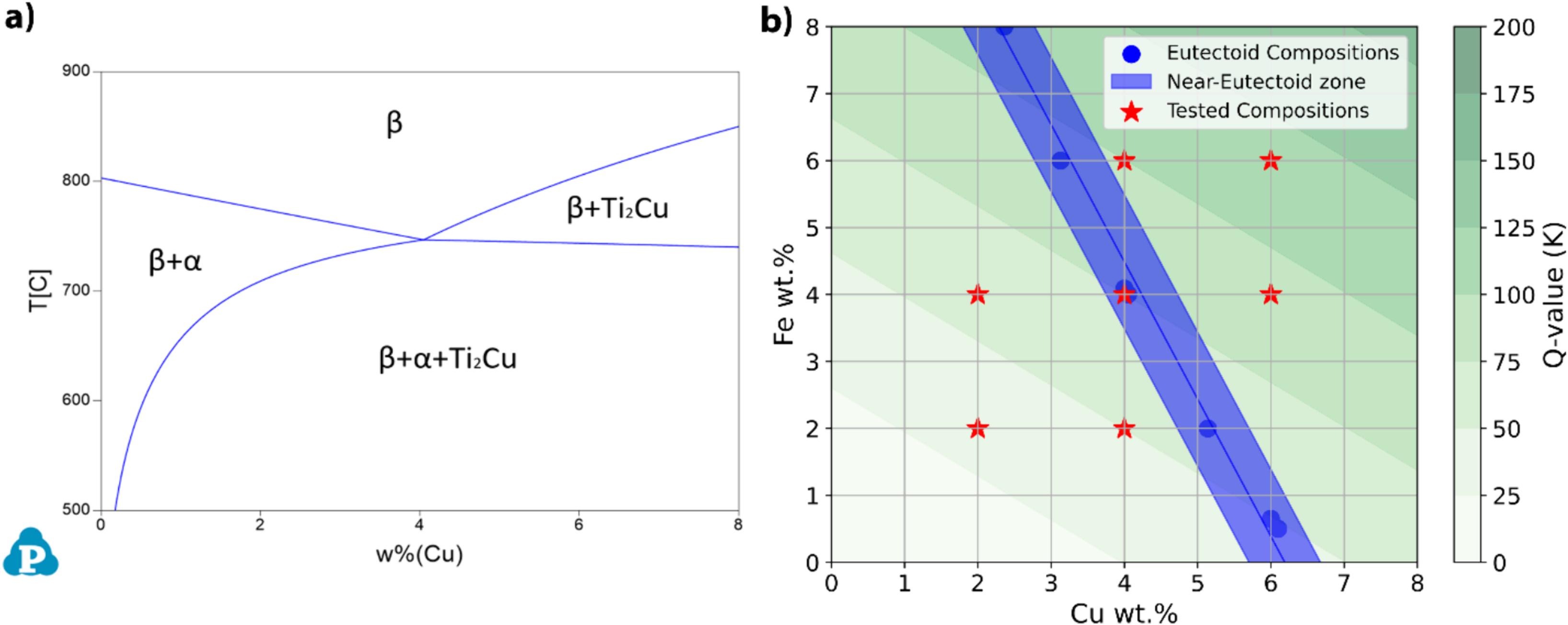 图 1.a ) ti-xcu-4fe 共析温度附近的等值线,x 从 0到 8 wt%。b) 合金设计策略图,显示了共析成分和 Cu 和 Fe 成分从 0 → 8 %的 Q 值。