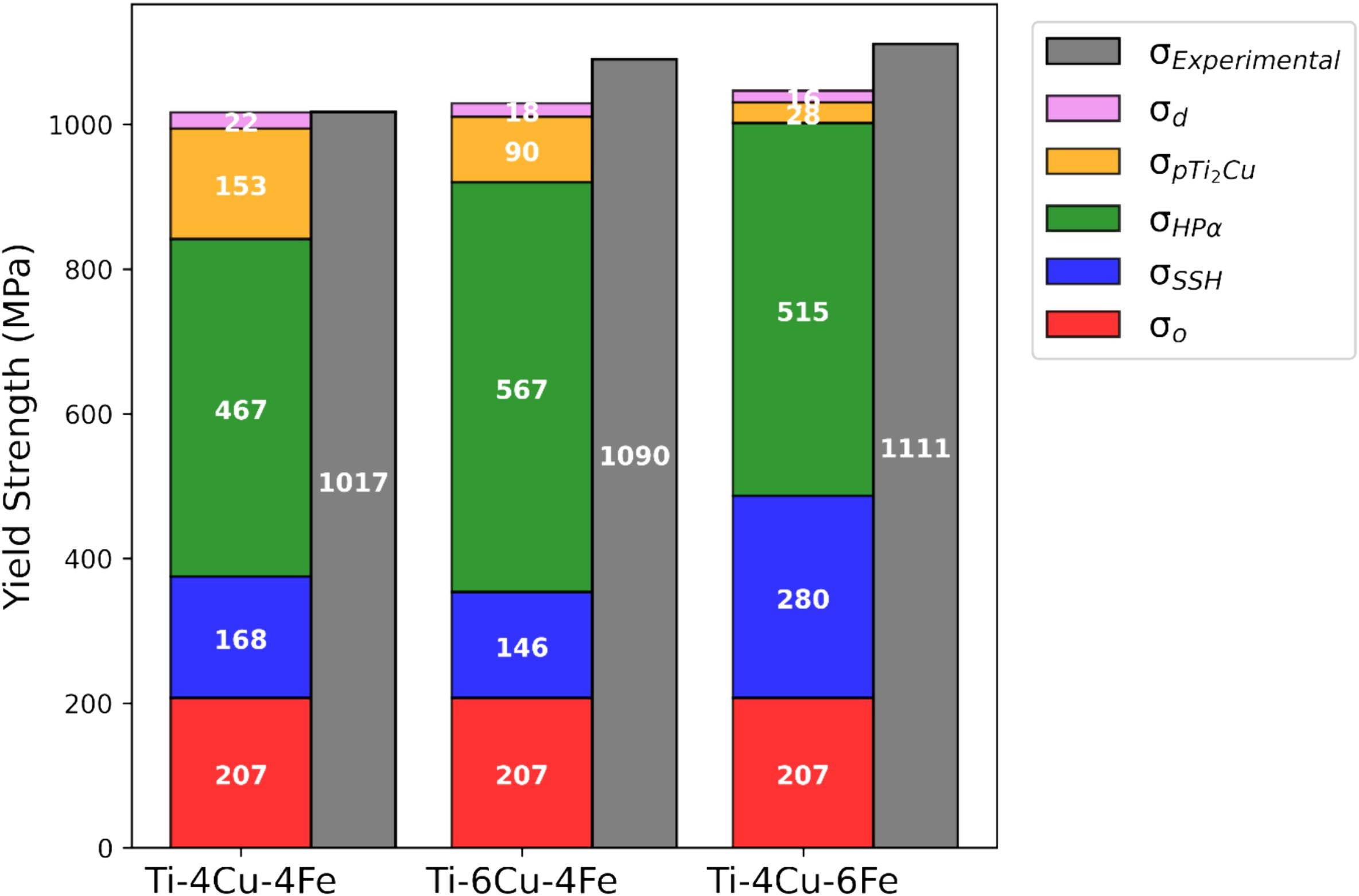 图12.各种模型化强化机制的贡献与实验屈服强度的比较:强化机制包括:纯钛的滑移激活应力、固溶强化、与α相的Hall-Petch关系、析出强化和森林位错强化。