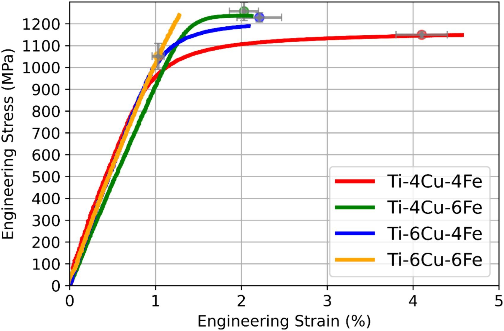 图 8.Ti -4Cu-4Fe、Ti-4Cu-6Fe、Ti-6Cu-4Fe和 Ti6Cu-6Fe 成分的代表性拉伸曲线。平均拉伸应力和断裂伸长率以点表示,误差线表示标准误差。