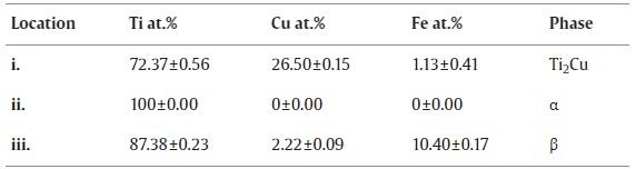 图 5.TEM图像和高分辨率 EDS 通过 TEM 显示了 α 相和残留 β 相交叉区域内不同相的元素浓度以及相间形成的金属间化合物。区域 i.、ii. 和 iii. 表示在样品内采集光谱的区域,并以