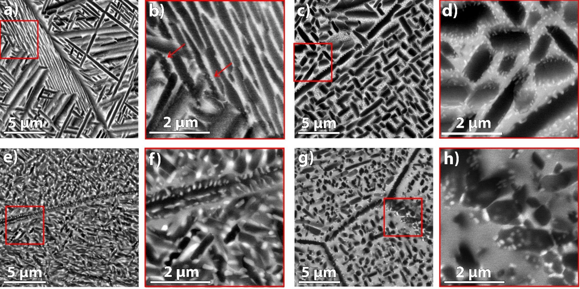 Ti-4Cu-6Fe。红色框表示相邻图像中放大的区域。最暗的颗粒/板条为 α 相,灰色基质为 β 相,最亮的颗粒为 Ti2Cu