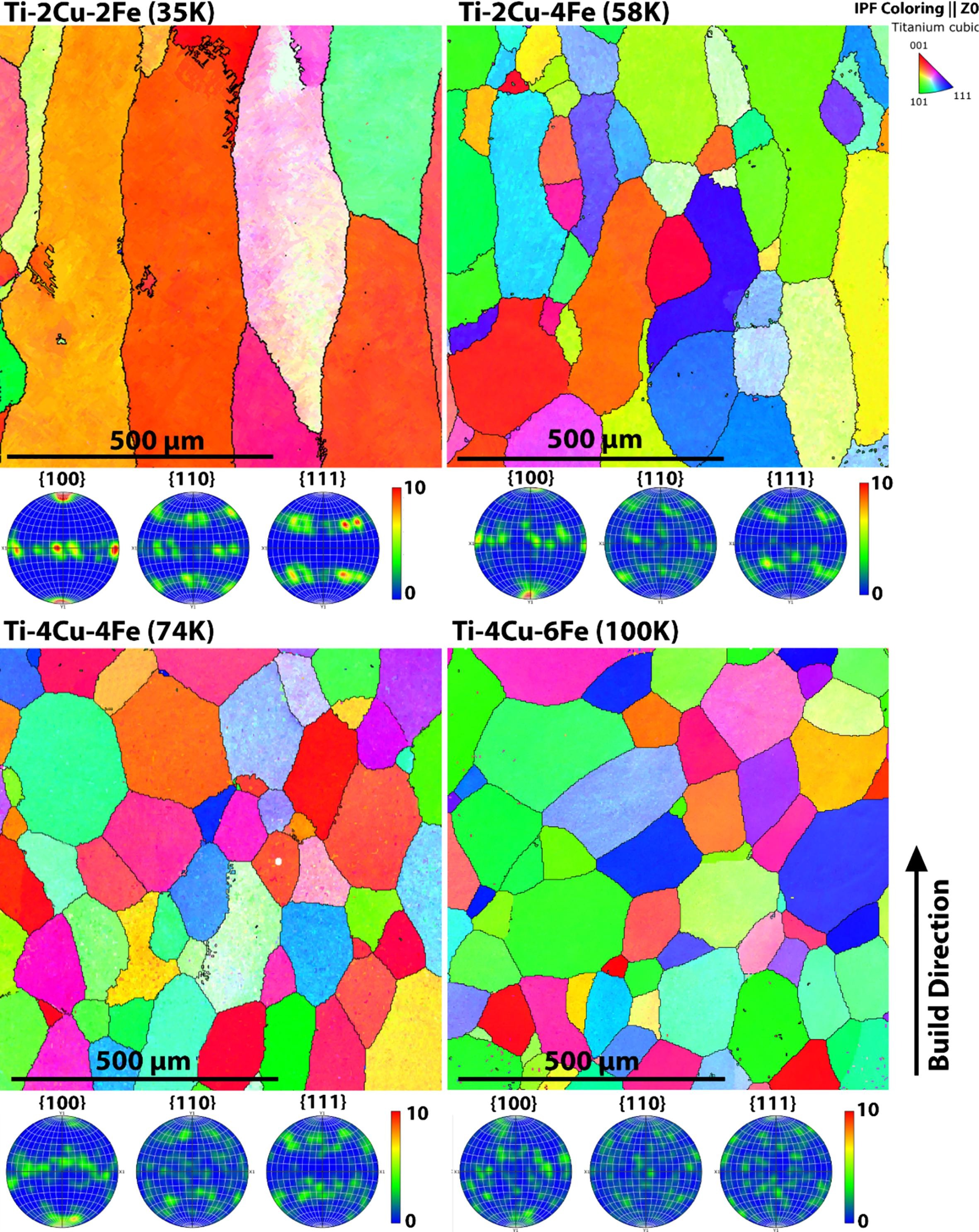 图 2.Ti -2Cu-2Fe、Ti-2Cu-4Fe、Ti-4Cu-4Fe和 Ti-4Cu-6Fe 进行母体晶粒分析后的 EBSD 图。IPF 着色与 Z0 方向平行(页面外)。
