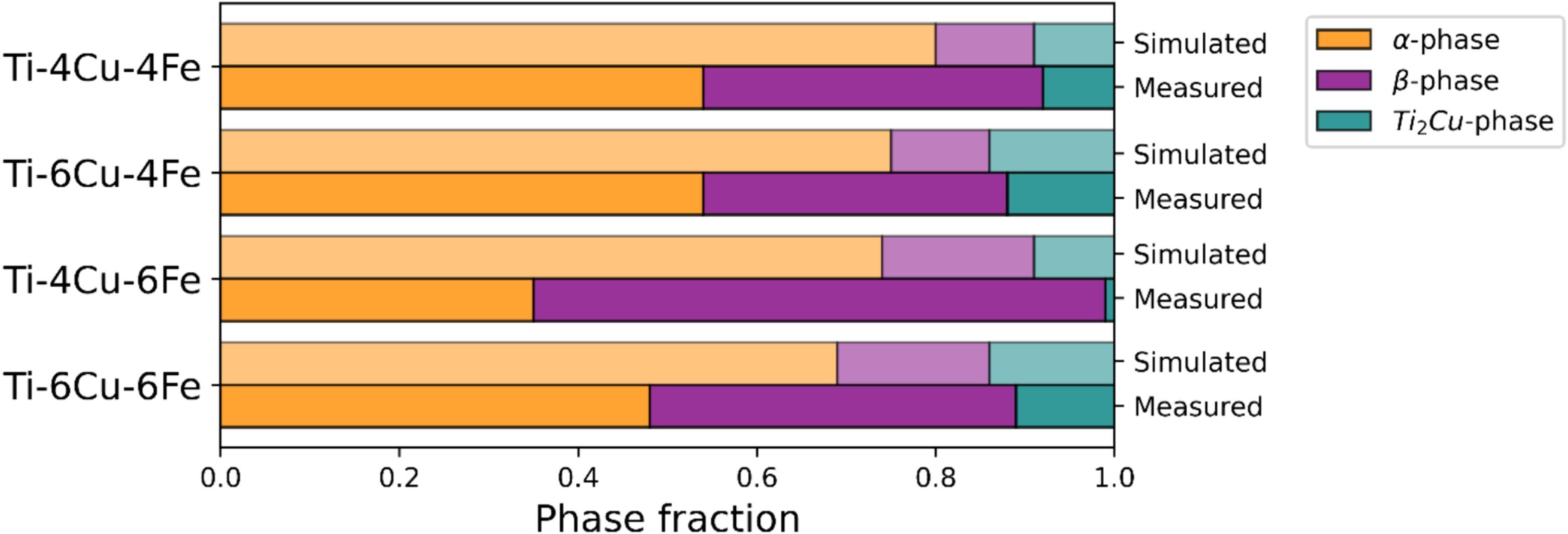 图 4.从Pandat(PanTi v2022)获得的室温下不包括 TiFe 的平衡相分数,并通过 SEM 成像计算出四种显示等轴微观结构的成分:Ti-4Cu-4Fe、Ti-6Cu-4Fe、Ti-4Cu-6Fe 和 Ti-6Cu-6Fe。