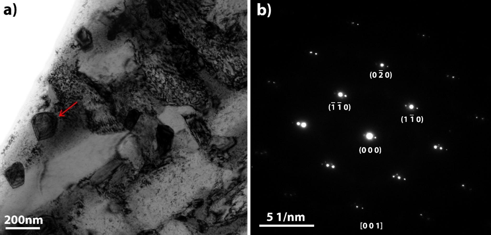 图 6.a ) Ti-4Cu-4Fe 的明场图像,红色箭头表示 b 中分析的 Ti 2