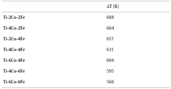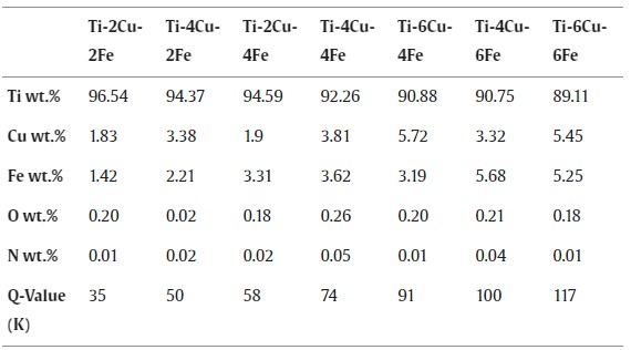 表 1.标称Ti-Cu-Fe 合金的 ICP-MS 分析和针对每种考虑成分计算出的 Q 值。