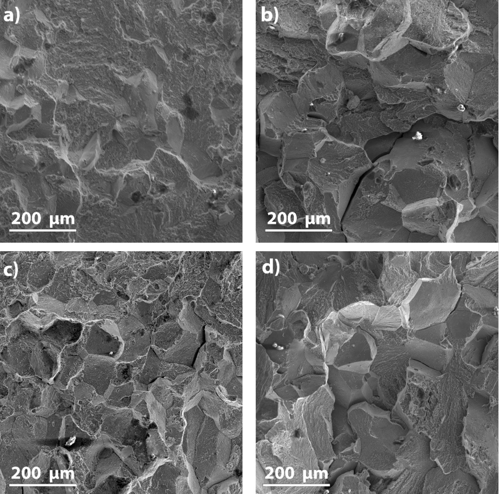 图 9.断口的二次电子图像。a) Ti-4Cu-4Fe,b)Ti-4Cu-6Fe,c) Ti-6Cu-4Fe 和 d)Ti6-Cu-6Fe。