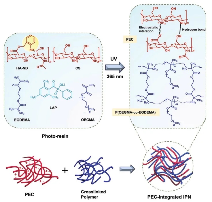 (1)首先,HA 的羧基被一个光致弱的邻硝基苄基修饰,以防止在 3D 墨水配制过程中过早形成 PEC。随后通过数字光处理(DLP)进行紫外线照射,同时触发 HA 羧基的光脱保作用和 OEGMA 交联水凝胶的光聚合作用,从而形成 PEC 集成 IPN 水凝胶。