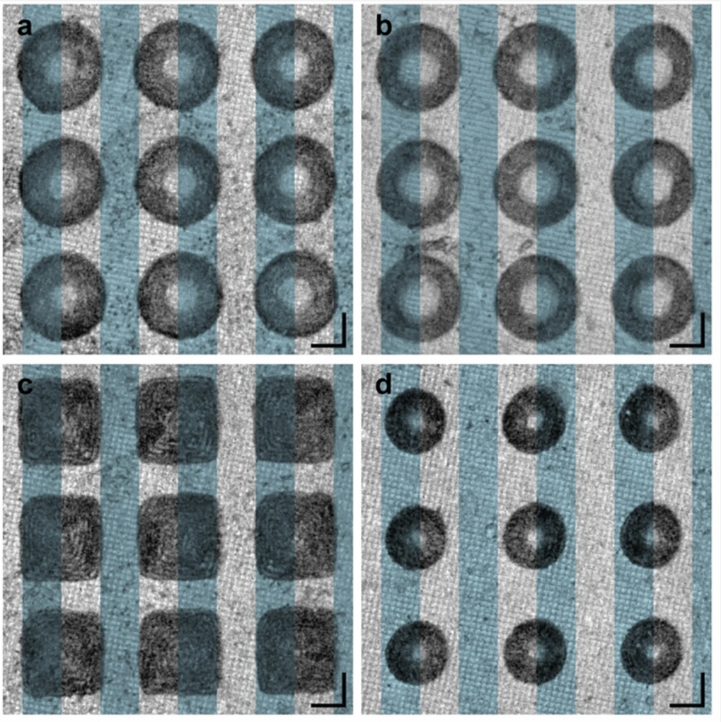 △ OCT 微井图像的叠加包括 (a) 半球形微孔、(b) 大截锥形微井、(c) 金字塔形v和 (d) 小截锥形微井。