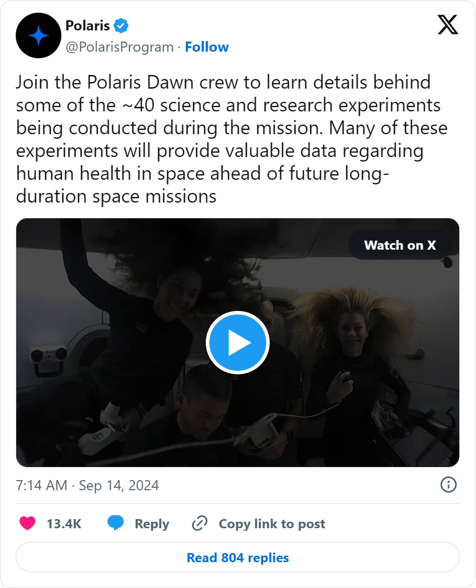 SpaceX还利用此次任务测试了新的通信技术,特别是Starlink的基于激光的空间通信技术。这可能为未来前往月球、火星及更远地区的任务铺平道路,可靠的通信系统将是至关重要的。