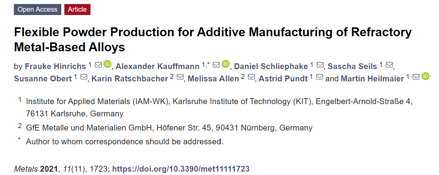 相关研究以题为“Flexible Powder Production forAdditive Manufacturing of Refractory Metal-Based Alloys”的论文发表在《Metals》期刊上。