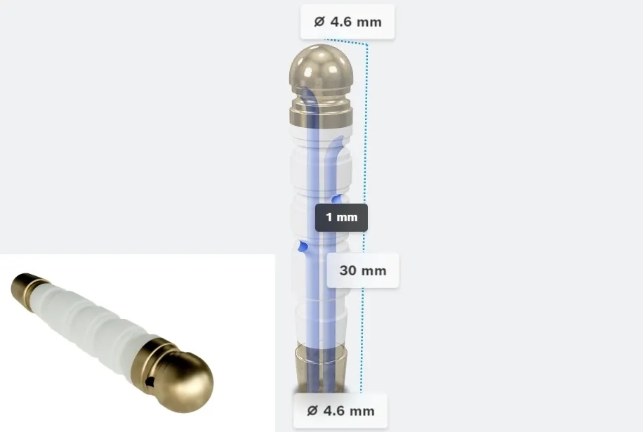 这是博世3D打印的一个具有复杂内部结构的四腔道陶瓷绝缘套管,在医疗设备中可作为装载传感器或有绝缘要求的部件,还可作为输送药物或流体的部件,两端附加了金属镀层。陶瓷绝缘套管长30 mm,直径4.6 mm,内部有4个直径为1 mm的曲线通道,使用 99.8 %的氧化铝陶瓷材料,重量为1.7克,表面粗糙度Ra = 0.8 μm。通过金属镀层,不仅提高了表面光洁度使其更易清洗,同时也使绝缘陶瓷在特定位置增加了导电性能。