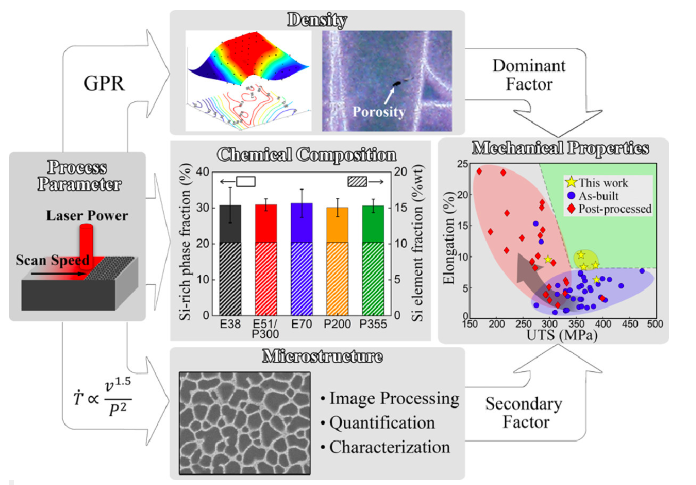 随着大数据时代的到来,机器学习和深度学习不断应用于各行各业。2020年10月澳大利亚新南威尔士大学机械与制造工程学院提出了一种基于高斯过程回归的机器学习方法来确定LPBF的最佳加工窗口。如图1所示,使用这种方法,发现了一个新的和更大的LPBF工艺优化窗口,得到了更高致密度的AlSi10Mg样品。新确定的优化加工参数使以前无法实现的高强度和延展性的组合成为可能。工艺参数直接决定材料的微观结构(晶粒结构、亚晶粒尺寸以及晶界形貌等),细微的结构差异导致材料力学性能的显著波动。因此该研究建立的方法可以很容易地应用于合金LPBF工艺优化和力学性能操控。